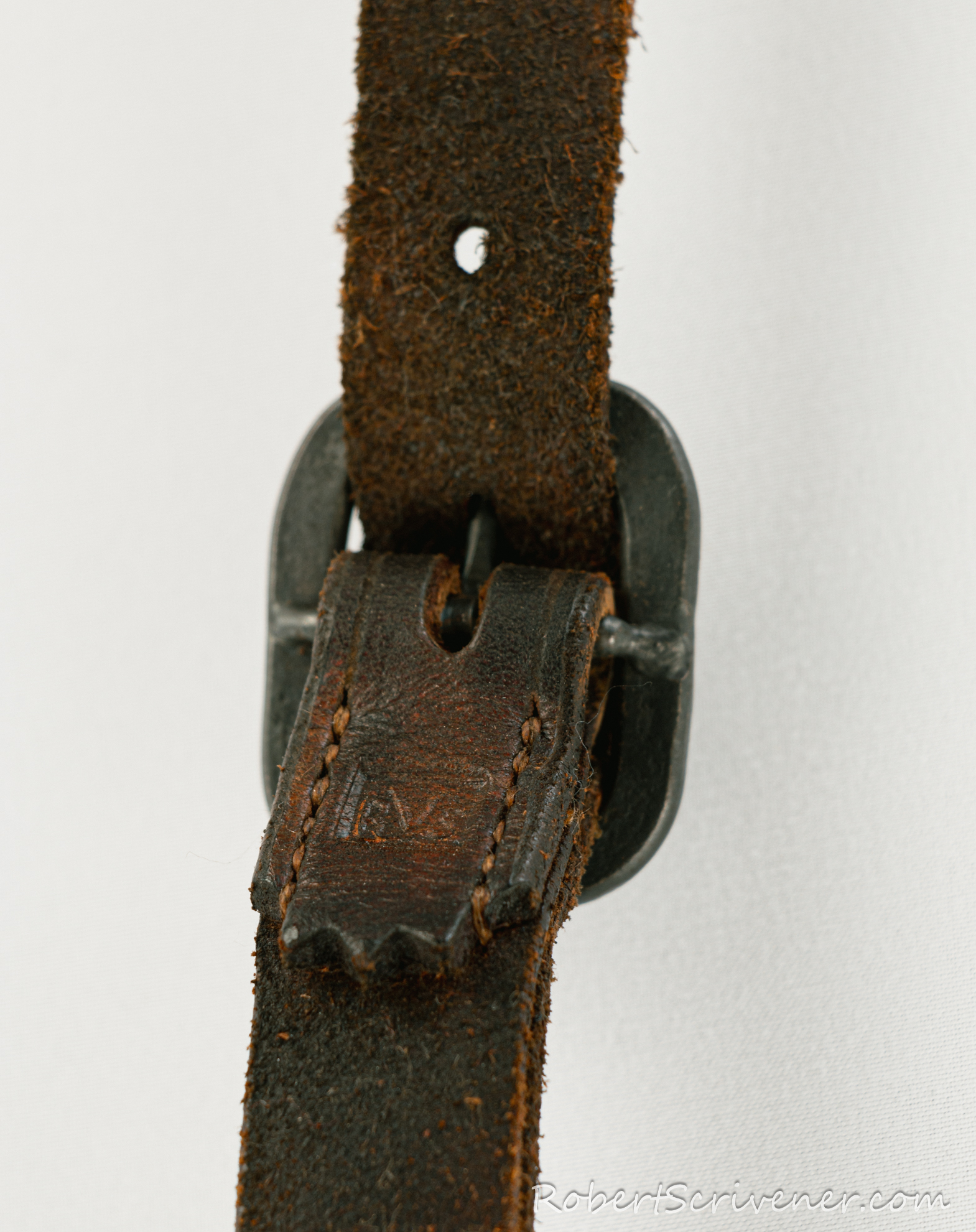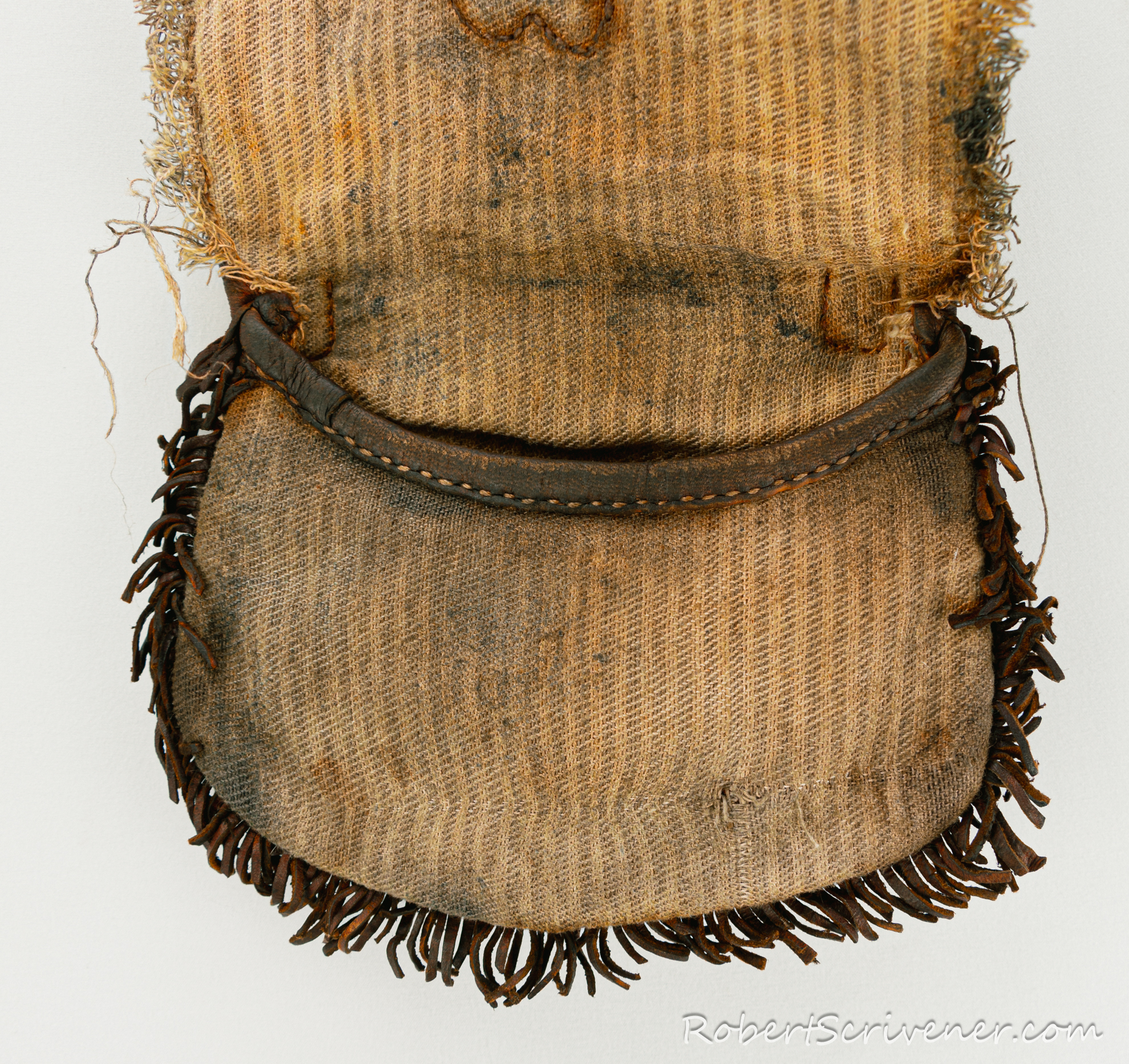Small day bag made from bark-tanned deer hide and heavy ticking. It features a hand-forged buckle, an adjustable cowhide strap, and a heart appliqué weighted with lead shot to help keep the flap securely closed.
